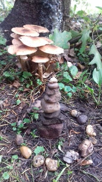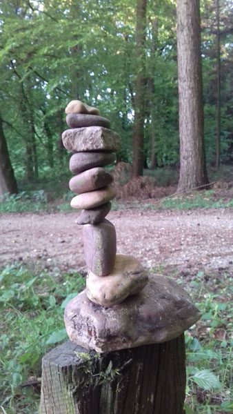 En om me nog wat meer te verbinden met de natuur maak ik soms een bouwseltje van mooie stenen. Gewoon keien en kiezels die ter plekke voor het oprapen liggen. Die probeer ik op te stapelen zo hoog als lukt.